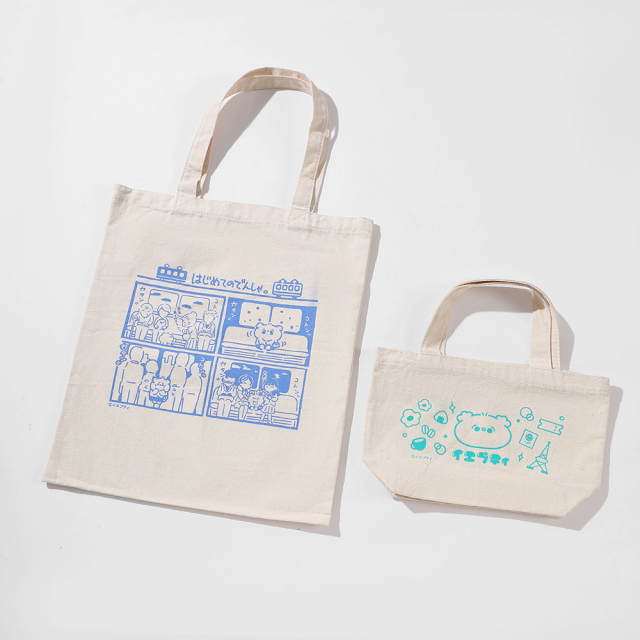 イエプティがあこがれのトカイに繰り出した思い出の漫画「はじめてのでんしゃ。」をプリントしたトートバッグと、